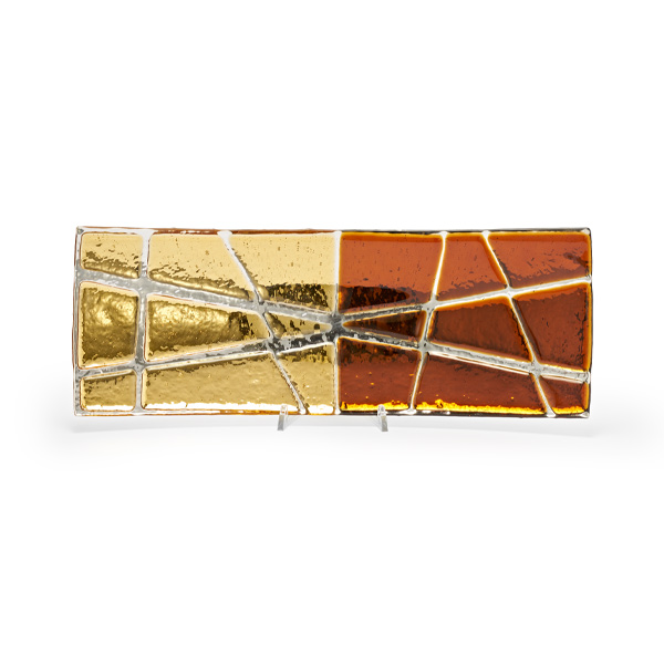 Brillance et préciosité ensemble dans un plateau rectangulaire, créé avec la technique du Spaccato par sages maîtres de l’art du verre. L’ambre et le topaze s’unissent pour donner vie à un jeu des couleurs chaudes sur le froid argent, en créant un contraste qui rappelle les décorations de l’antique Égypte. Culture, tradition et innovation se fondent pour créer un produit totalement unique au monde et Fabriqué en Italie.